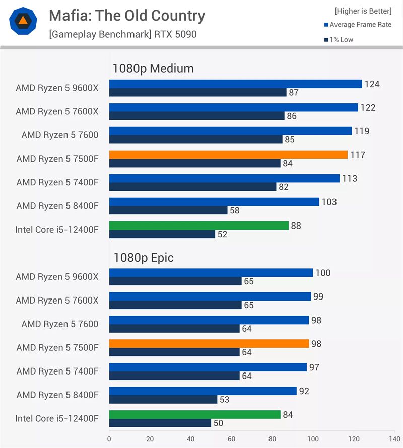 Tiếp theo là Mafia: The Old Country, vì một lý do nào đó, 12400F gặp khó khăn với tựa game này, hiệu năng chỉ dưới 90 fps với mức thấp 1% tương tự 8400F. Điều này giúp 7500F nhanh hơn trung bình 33% ở cài đặt trung bình, và nhanh hơn đáng kể 62% khi so sánh mức thấp 1%.