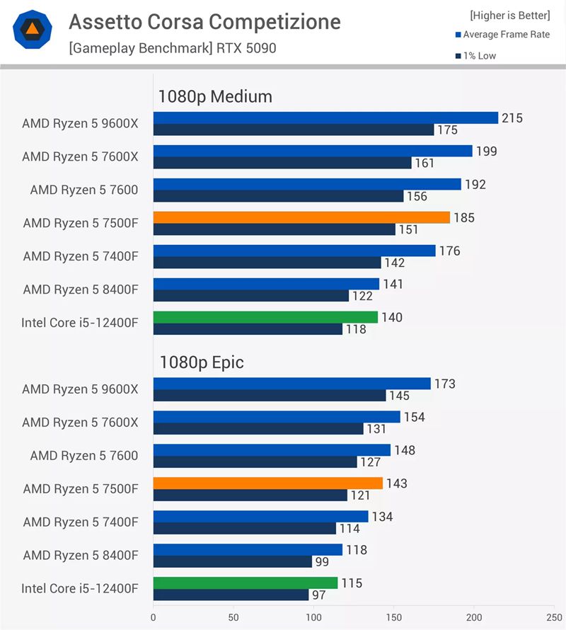 7500F thể hiện sự vượt trội rõ rệt trong ACC. Một lần nữa, chúng ta thấy 12400F có hiệu năng tương đồng với 8400F. Với cài đặt trung bình, 7500F nhanh hơn 32% và nhanh hơn 24% ở cài đặt Epic. Đây là một chiến thắng dễ dàng dành cho Ryzen 5, và nó hoạt động tốt hơn nhiều trong việc mang lại trải nghiệm tốc độ làm mới cao ở mức cài đặt chất lượng tối đa.