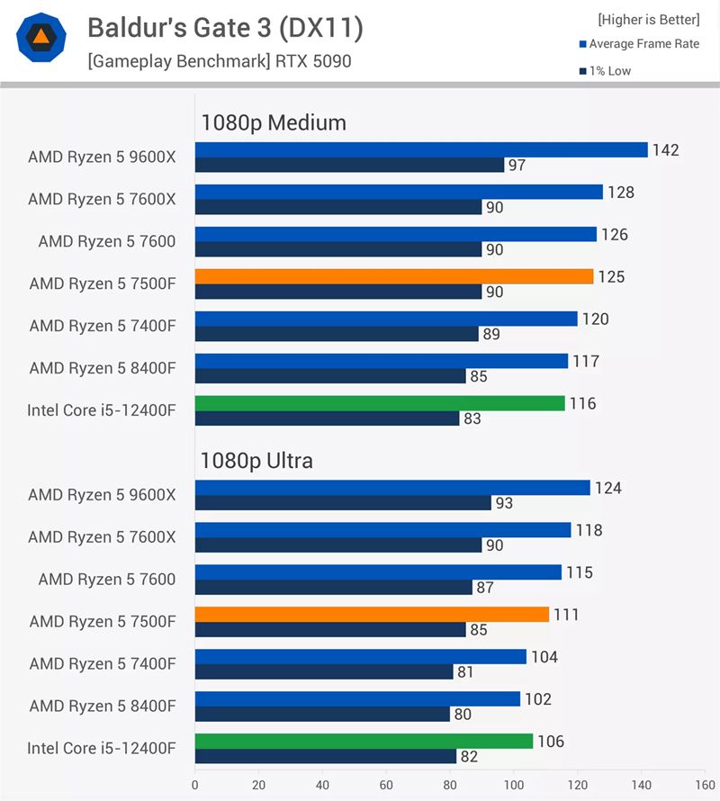 Dù là tựa game ngốn CPU, hiệu năng giữa 12400F và 7500F lại rất tương đồng trong Baldur's Gate 3. 7500F chỉ nhanh hơn 8% ở cài đặt trung bình và 5% ở cài đặt siêu cao. Về cơ bản, không có sự khác biệt nào đáng kể giữa chúng, và bạn khó lòng nhận ra mình đang sử dụng CPU nào chỉ dựa trên trải nghiệm.