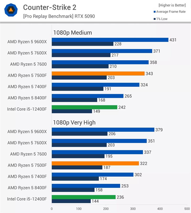 Nếu bạn là một game thủ Counter-Strike 2 chuyên nghiệp, 7500F là lựa chọn tốt hơn. Nó nhanh hơn 42% ở cài đặt trung bình và 36% ở cài đặt rất cao.