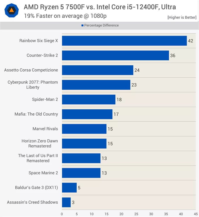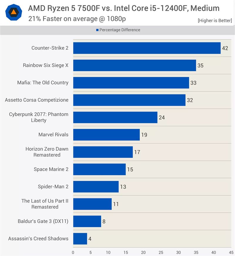 Biểu đồ sau so sánh hiệu năng giữa 12400F và 7500F trên cả 12 tựa game dựa trên biên độ hiệu năng riêng lẻ. Lợi thế lớn nhất của Ryzen 5 thuộc về Counter-Strike 2, tiếp theo là Rainbow Six Siege, cho thấy 7500F đặc biệt phù hợp với các tựa game thể thao điện tử. Chúng tôi cũng ghi nhận biên độ hiệu năng rất lớn trong Mafia: The Old Country.