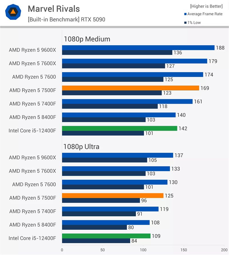 Đầu tiên là Marvel Rivals, chúng tôi sử dụng công cụ benchmark tích hợp sẵn để bạn có thể dễ dàng đối chiếu kết quả. Ở cài đặt trung bình, 12400F cho hiệu suất trung bình 142 fps, với mức fps thấp nhất 1% là 101 fps - hoàn toàn đủ cho trải nghiệm chơi game mượt mà. Tuy nhiên, 7500F thể hiện sự vượt trội với tốc độ nhanh hơn gần 20%, đạt 169 fps, mang đến trải nghiệm tốt hơn trên các màn hình có tần số quét cao.