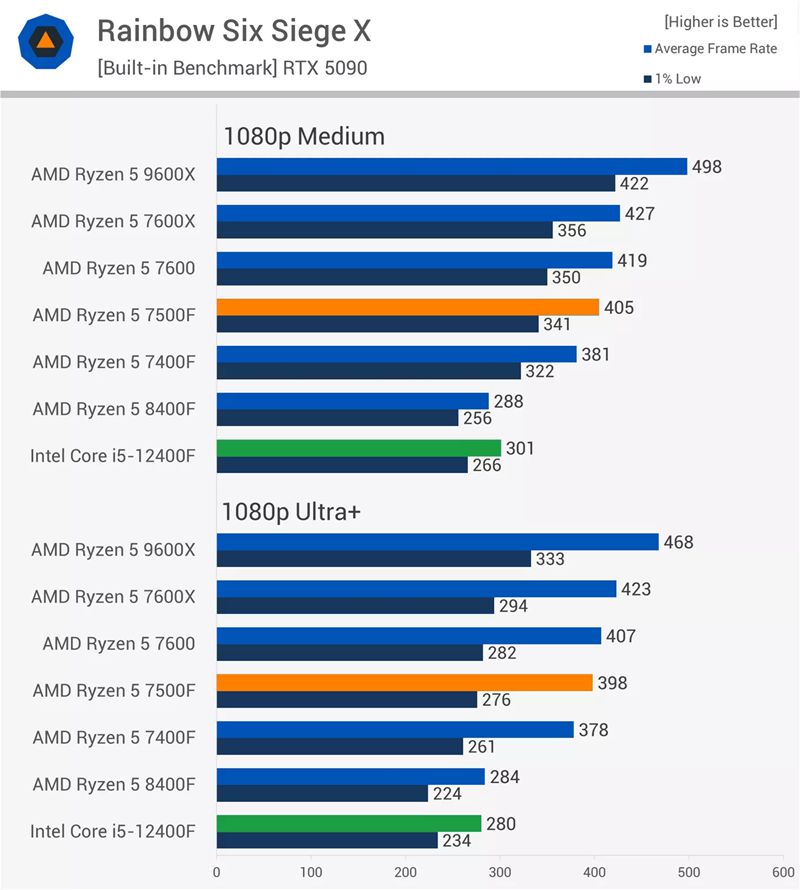 Tiếp theo là Rainbow Six Siege X. 12400F cho thấy lý do vì sao nó được nhiều người yêu thích khi vẫn đạt hơn 300 fps, cụ thể là 301 fps. 7500F nhanh hơn 35%, nhưng với hầu hết người chơi, việc tăng từ 300 lên 400 fps khó có thể cảm nhận rõ rệt.