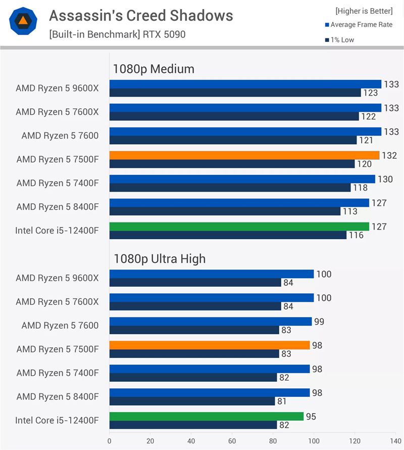 Trong các tựa game bị giới hước nhiều bởi GPU như Assassin's Creed Shadows, CPU không còn đóng vai trò quá quan trọng và giá trị của 12400F được thể hiện rõ. Ở đây, 7500F chỉ nhanh hơn chưa đến 5%, nghĩa là hiệu năng gần như tương đương và trải nghiệm chơi game sẽ không có khác biệt đáng kể.