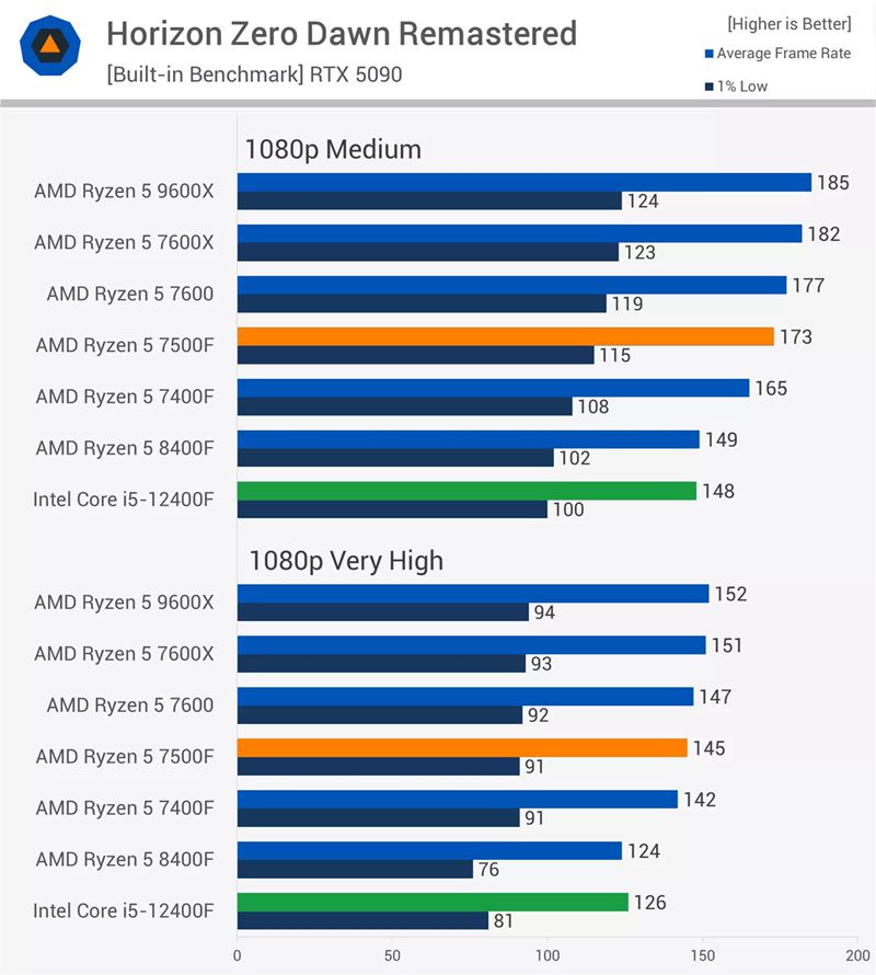 12400F cũng mang lại trải nghiệm tuyệt vời trong Horizon Zero Dawn Remastered, đạt trung bình 148 fps ở cài đặt trung bình. Con số này giúp 7500F có lợi thế 17%. Nó cũng nhanh hơn 15% khi sử dụng cài đặt rất cao, và khoảng cách này có ý nghĩa hơn một chút khi đẩy mức trung bình từ 126 fps lên 145 fps.