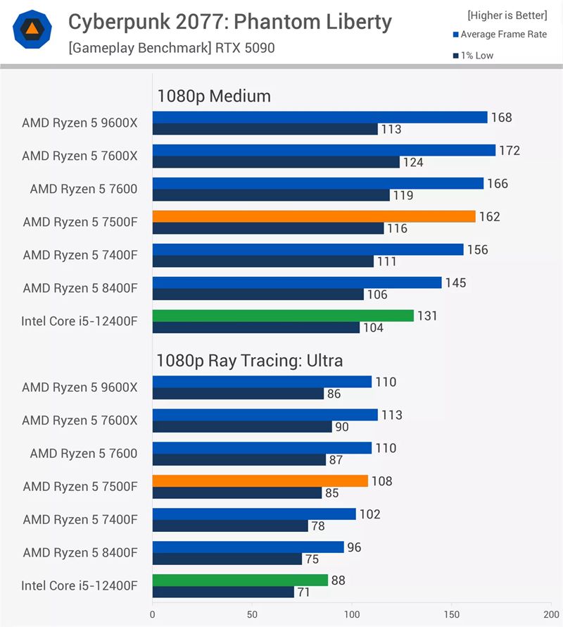 Chuyển sang Cyberpunk 2077, 12400F đạt trung bình 131 fps với cài đặt trung bình, giúp 7500F dẫn trước 24%, dù chỉ nhanh hơn 12% khi xét đến mức thấp 1%. Điều thú vị là lợi thế 23% vẫn nghiêng về 7500F khi sử dụng cài đặt dò tia siêu tốc, nâng mức trung bình từ 88 fps (12400F) lên 108 fps. Mức thấp 1% cũng chứng kiến mức tăng tương tự 20%.