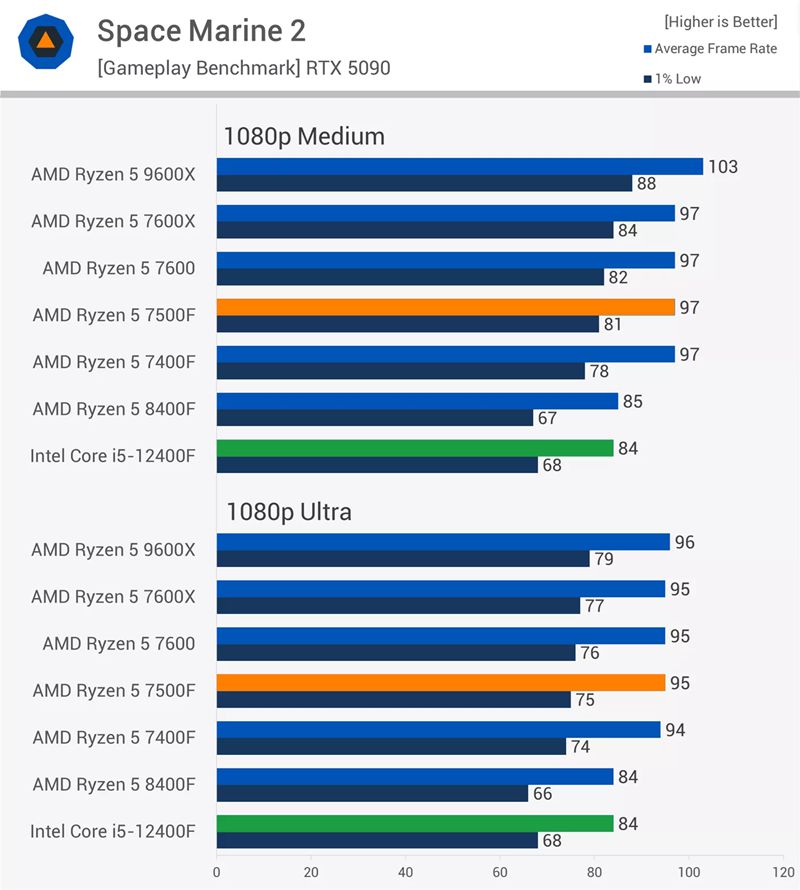 12400F gặp chút khó khăn trong Space Marine 2, hiệu năng bị giới hạn ở mức tương tự 8400F với tốc độ khung hình trung bình vào khoảng 80. Điều này có nghĩa 7500F nhanh hơn 15% ở cài đặt trung bình và 13% ở cài đặt cực cao.