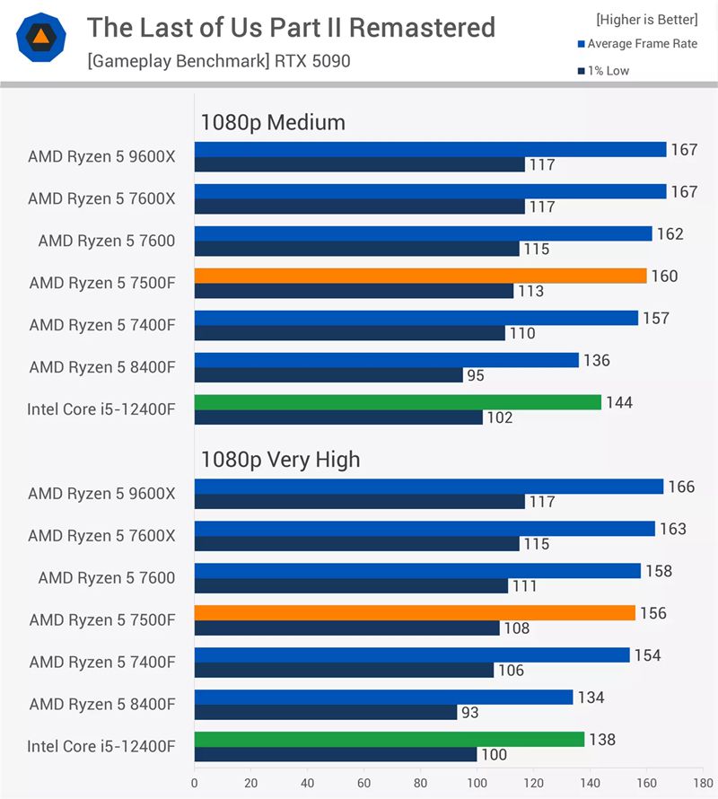 Hiệu năng trong The Last of Us Phần II khá cạnh tranh. 7500F chỉ nhanh hơn 11% ở cài đặt trung bình và 13% ở cài đặt rất cao. Dù rõ ràng Ryzen nhanh hơn, nhưng khoảng cách này không thực sự đáng kể.