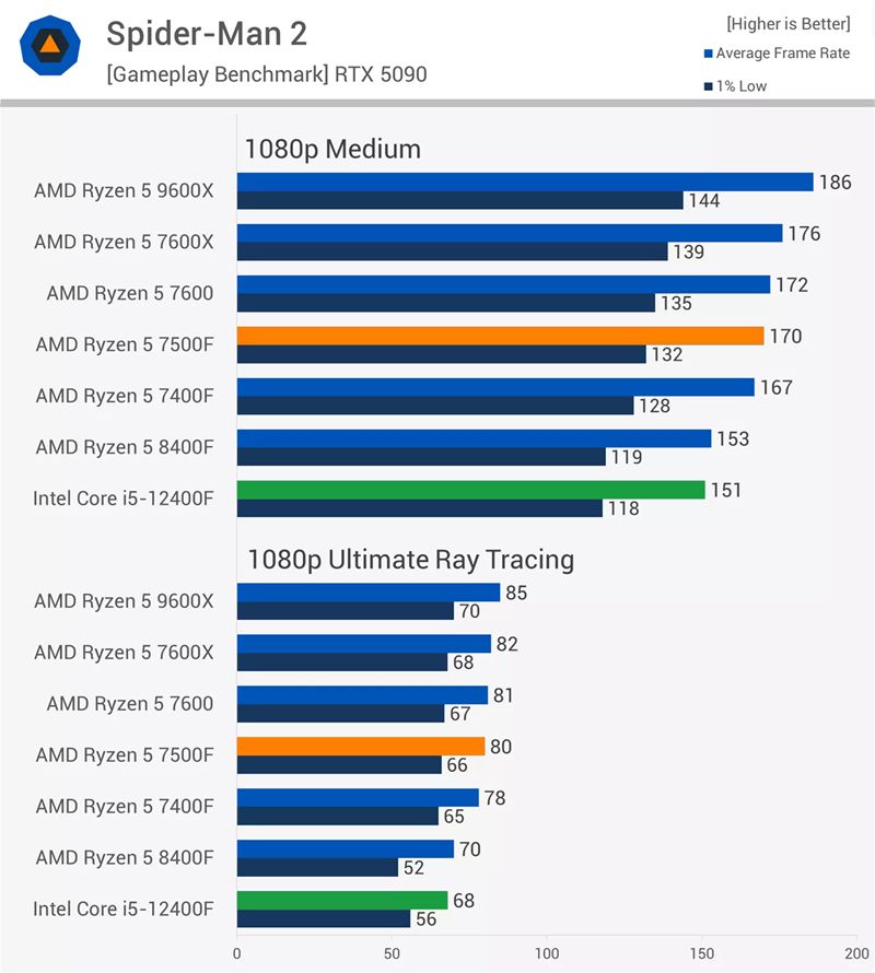 Thử nghiệm Spider-Man 2 cho thấy 7500F nhanh hơn 13% ở cài đặt trung bình, đẩy tốc độ trung bình từ 151 fps (12400F) lên 170 fps. Khi sử dụng thiết lập dò tia tối ưu, biên độ tăng lên 18%, và mức tăng này rất có ý nghĩa khi sự nhảy vọt từ 68 fps lên 80 fps là rất đáng chú ý.