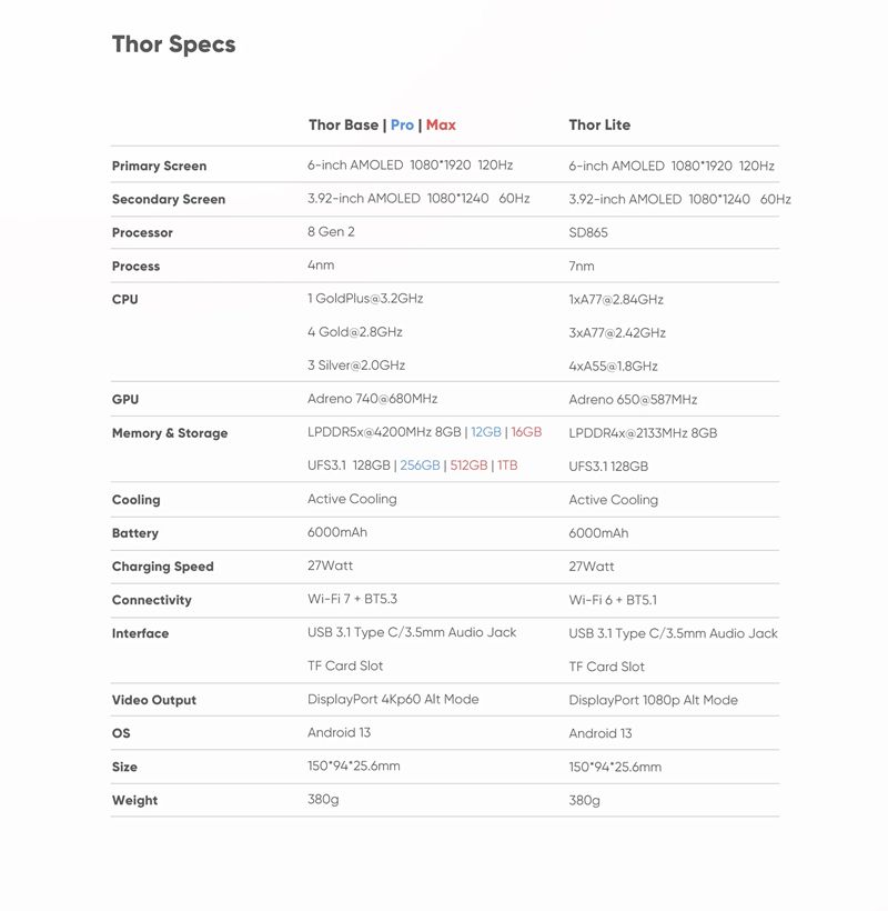 AYN Thor: Áp dụng cho các bản dùng chip Snapdragon 8 Gen 2, gồm Thor Base (8GB/128GB), Thor Pro (12GB/256GB) và Thor Max (16GB/512GB). Riêng Thor Lite (Snapdragon 865) vốn đã dùng UFS 3.1 nên không bị ảnh hưởng.