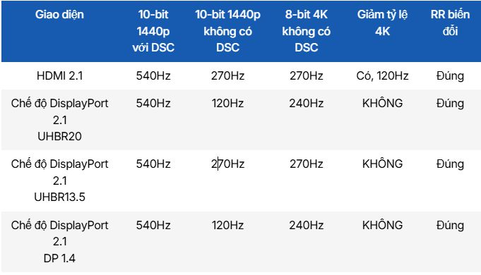 Dù sở hữu cổng DisplayPort 2.1 băng thông cao, bạn vẫn cần kỹ thuật nén DSC (Display Stream Compression) để đạt 540Hz ở 1440p. Đáng tiếc, màn hình này thiếu cổng USB-C và không có bộ chuyển đổi KVM - một điểm trừ cho những ai cần sử dụng đa nền tảng.