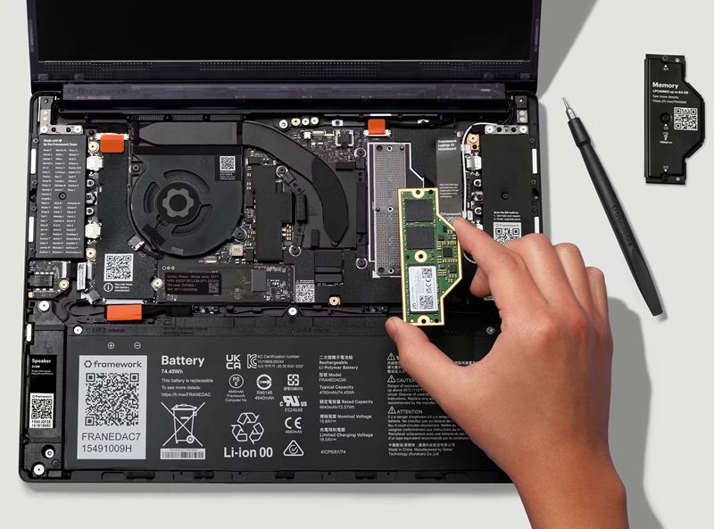 Pin 74Wh mới, tăng 22% thời lượng pin so với thế hệ trước, cũng tương thích ngược với các máy Framework 13 đời cũ (dù cần thêm vỏ đáy mới vì pin dày hơn).