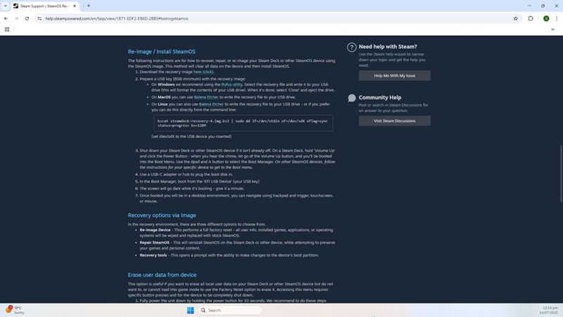 - Hãy bắt đầu bằng cách truy cập hướng dẫn khôi phục SteamOS chính thức: Hướng dẫn khôi phục SteamOS