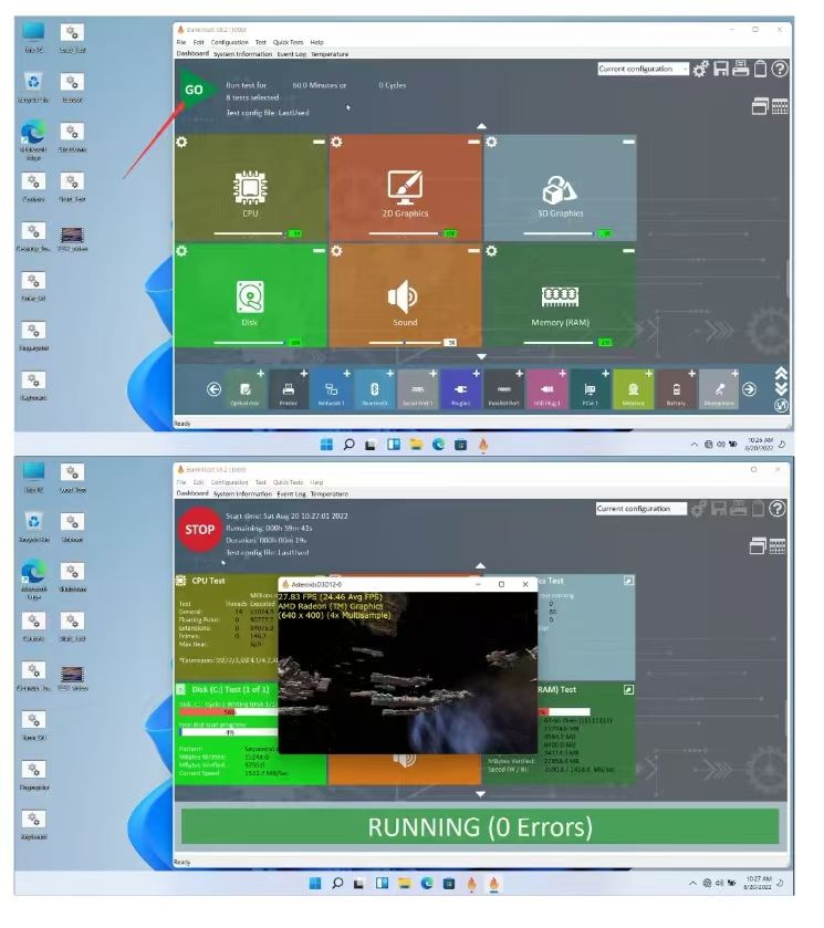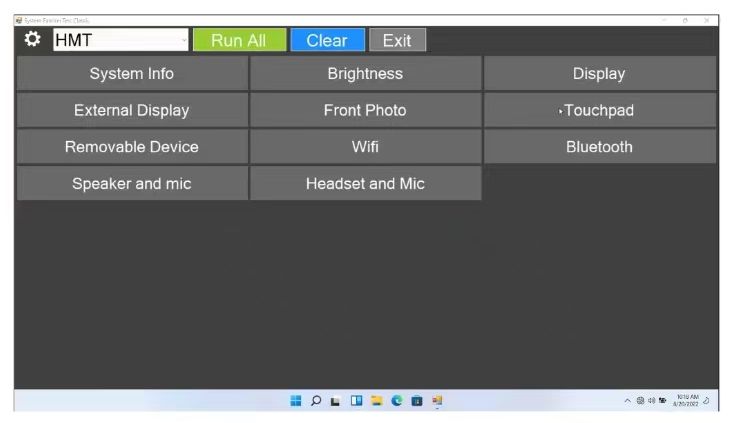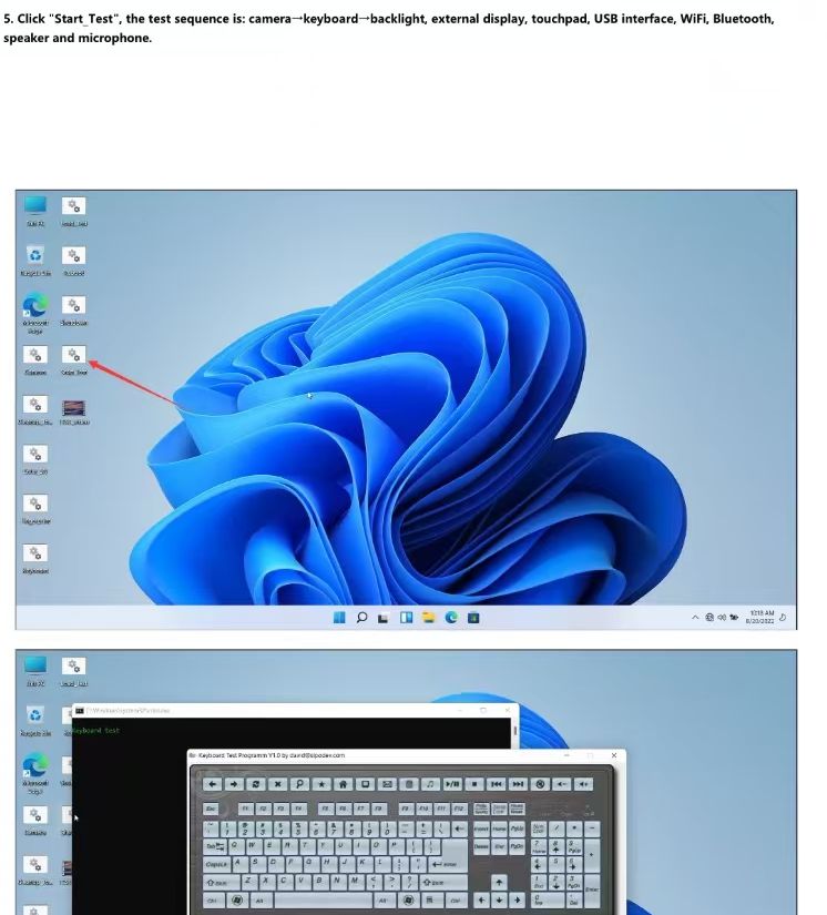 - Nếu bạn cần kiểm tra phần cứng thì nhấp vào "Start_Test", như hình dưới, trình tự kiểm tra là: đèn nền bàn phím camera, màn hình ngoài, bàn di chuột, giao diện USB, WiFi, Bluetooth, loa và micrô.