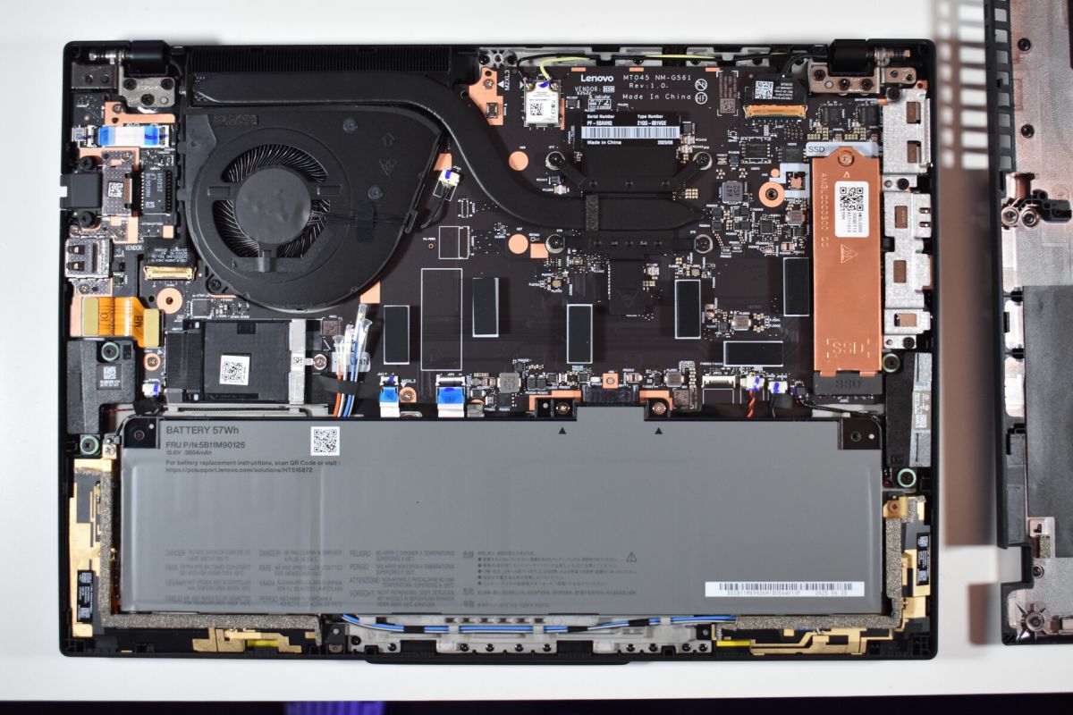 Khi đã mở máy, bạn sẽ thấy bên trong đơn giản hơn so với hầu hết các dòng ThinkPad T khác. Nguyên nhân là do nền tảng Lunar Lake có RAM được hàn chết trực tiếp vào CPU, nên người dùng không thể tự nâng cấp RAM.