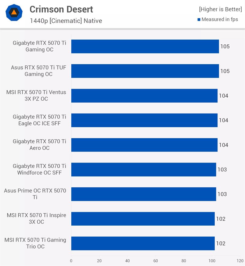Chúng tôi đã thử nghiệm nhanh hiệu năng chơi game với tựa game Crimson Desert. Kết quả cho thấy sự chênh lệch giữa các mẫu card chỉ khoảng 3% – một tin vui lớn, đặc biệt nếu so sánh với mức chênh lệch lớn hơn nhiều mà chúng tôi từng ghi nhận giữa các phiên bản Radeon RX 9070 XT.