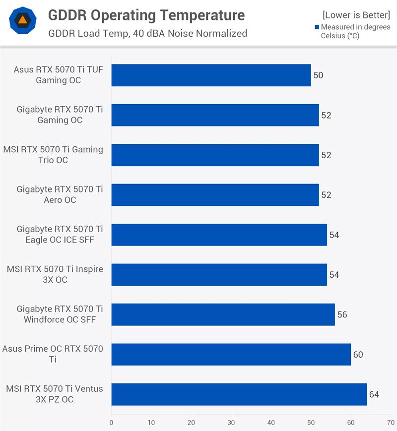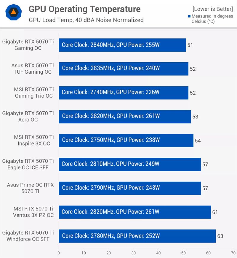 Khi chúng tôi chuẩn hóa dữ liệu về độ ồn, Gigabyte Gaming OC và Asus TUF Gaming OC tiếp tục thể hiện xuất sắc. MSI Gaming Trio OC đạt 52°C, Gigabyte Aero OC ở mức 53°C. Trong khi đó, Ventus và Windforce hoạt động kém hơn một chút, cho thấy chúng cần quạt chạy nhanh hơn để đạt được hiệu năng tản nhiệt tương tự.