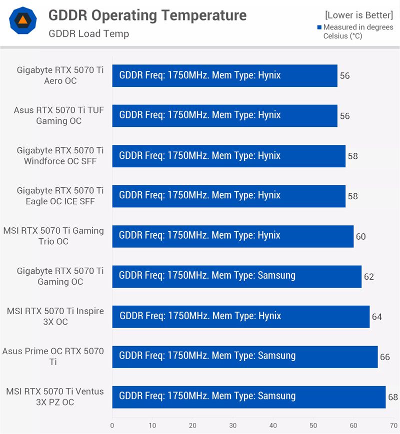 Về nhiệt độ bộ nhớ, hầu hết các card trang bị bộ nhớ Hynix đều hoạt động mát hơn so với Samsung.