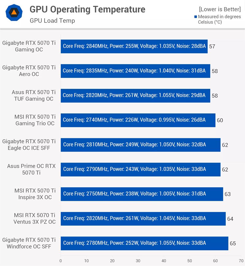 Nhìn chung, không có chiếc card nào trong số này thực sự “nóng” hay “ồn ào”. Ngay cả mẫu nóng nhất cũng chỉ ở mức 65°C – một con số rất an toàn.